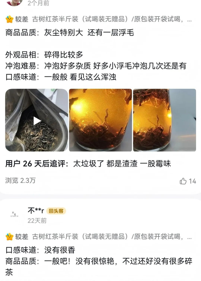 “古树”概念涉嫌虚构——宣传主打“古树红茶”,但实物无论干茶形态、冲泡香气还是叶底质感,均不符合古树红茶的典型特征。很多消费者也反馈:“一点香气都没有,根本不像古树茶。”