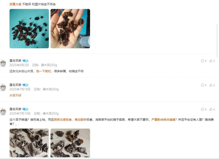 图片说明:很多买家反馈木耳品质有问题,晒出的照片和商家宣传差别太大。