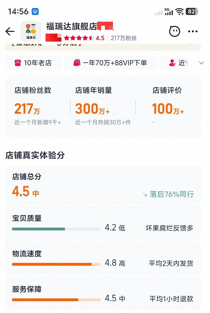更令人震惊的是,3月9日,记者在该旗舰店看到,这家“10年老店”粉丝数达217万,近一年有70万+88VIP下单。然而店铺真实体验分仅为总分4.5(中),落后76%同行;其中宝贝质量分只有4.2(低),原因是“坏果腐烂反馈多”。