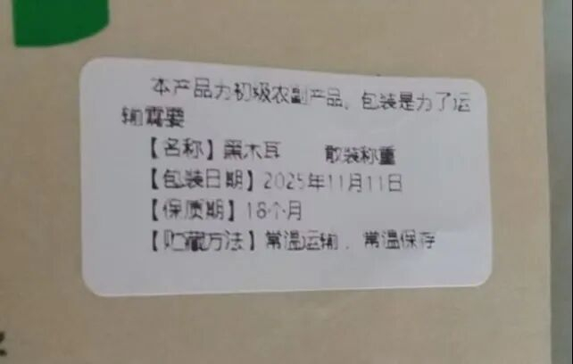 颜色暗淡、有股霉味,碎片很多,甚至夹杂着细碎的木屑。包装上粘贴的标签只标注了生产日期但未标注生产厂家、产地及经销商等关键信息,不符合预包装食品标签相关规定。消费者收到这样的“三无”产品,第一感就是:我怎么相信这是东北木耳?