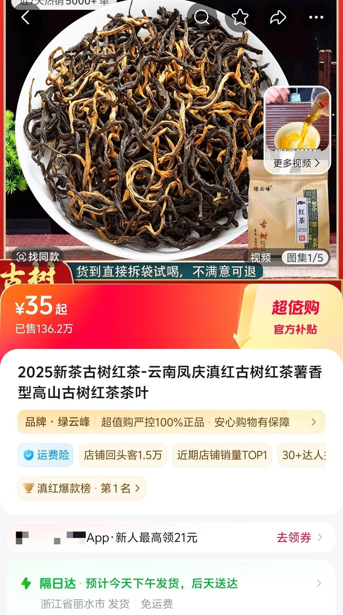 然而,有不少消费者反馈同款产品“货不对板”。记者根据线索,对这款标注为“2025新茶古树红茶”进行调查了解。