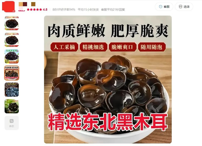 根据消费者的反馈,在“淘宝买菜农场直发直播”平台,一款名为“0添加正宗东北野生黑木耳干货”的商品,商家描述完美无瑕,但买家评价“现实骨感”。