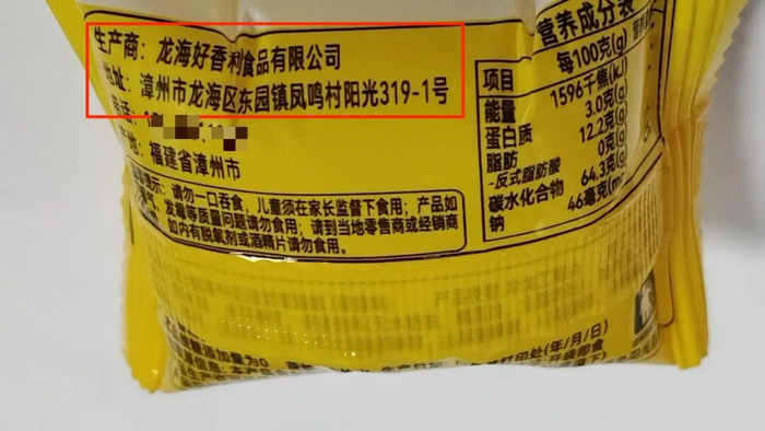 更离奇的是,这家旗舰店页面显示的生产厂家为“陈鸿记(龙海)食品有限公司”,地址在福建漳州龙海区白水镇楼埭村树兜168号;而实物包装上印制的生产厂家却是“龙海好香利食品有限公司”,地址在龙海区东园镇凤鸣村阳光319-1号。