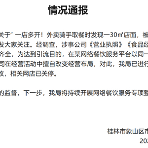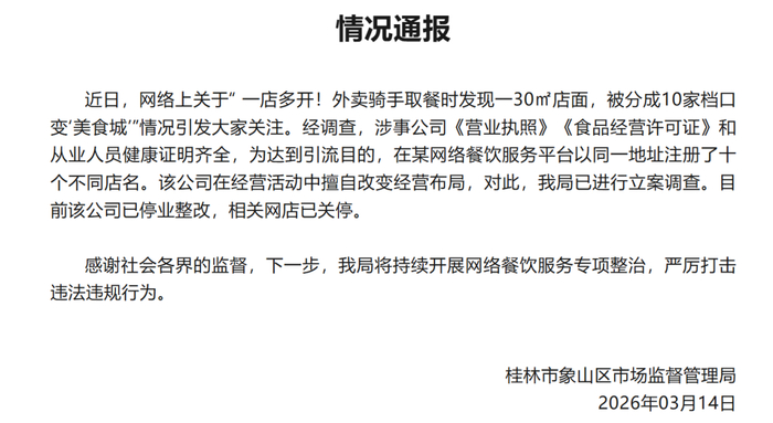 近日,网络上关于“ 一店多开!外卖骑手取餐时发现一30㎡店面,被分成10家档口变‘美食城’”情况引发大家关注。经调查,涉事公司《营业执照》《食品经营许可证》和从业人员健康证明齐全,为达到引流目的,在某网络餐饮服务平台以同一地址注册了十个不同店名。该公司在经营活动中擅自改变经营布局,对此,我局已进行立案调查。目前该公司已停业整改,相关网店已关停。
