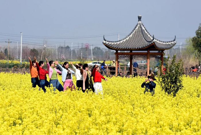 3月14日,游客在义安区西联镇郜村油菜花观赏园踏青赏花。连日来,随着铜陵气温回暖,乡村田园油菜花竞相绽放,田间一片金黄,春意盎然,吸引不少市民前来赏花打卡。(记者 过仕宁)
