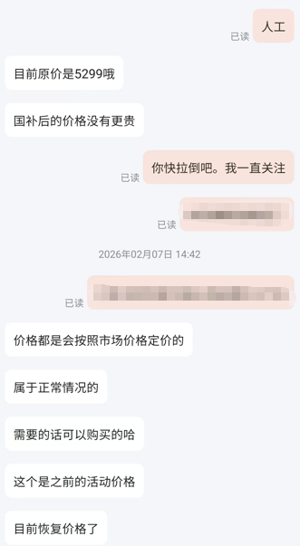 于是,他第一时间询问京东客服,客服先是确认该产品页面价格为5599元,补贴后到手价为4799元。随后又称:“目前原价是5299元,国补后的价格没有更贵。”针对于先生提出的涨价质疑,客服解释:“价格都是会按照市场价格变化的,属于正常情况。”