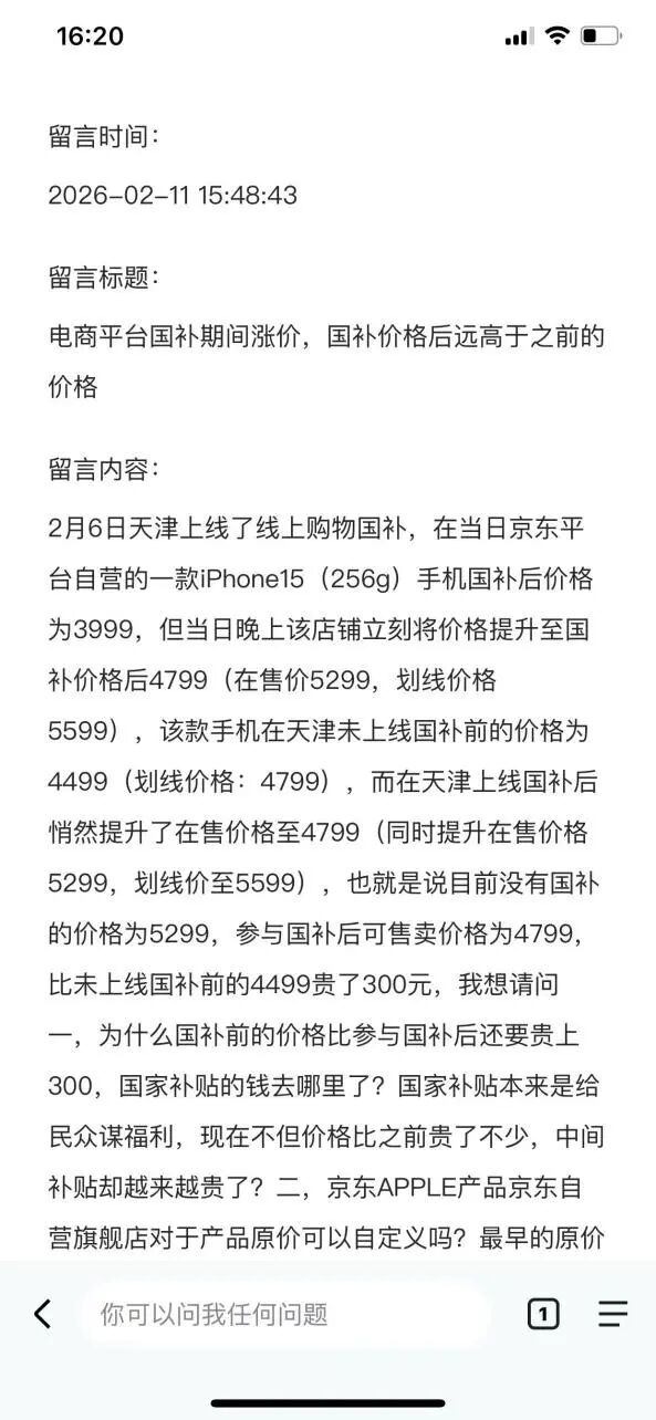 针对消费者质疑产品“国补”后涨价,客服称:“去年到今年都是有国补的,并不是才有国补的。”“每个客户都是这个价格。”但于先生则表示:“今年新一轮‘国补’,天津地区是2月6日才上线的。在此之前应该是没有的,那阵我关注到其他城市的价格更低。”