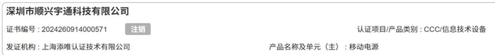 记者搜索电商平台发现,某款“3C认证可上飞机”户外应急20000毫安时大容量充电宝,其页面上传的3C认证编号的生产者为“顺兴宇通科技有限公司”,但该认证早在2025年5月就被注销。