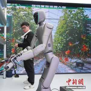 3月15日,河南郑州,工作人员训练人形机器人给植物授粉。当日,河南首家人形机器人4S店在郑州开业。中新社记者 韩章云 摄