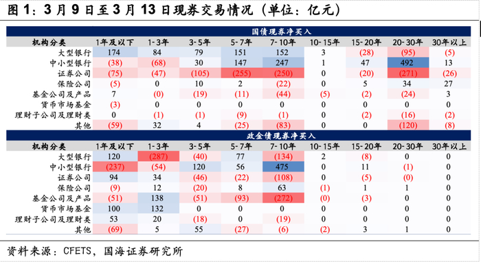 本周券商大幅卖出7Y、10Y、30Y国债,卖盘“一枝独秀”。从承接方来看,大行与中小行分别买入7Y、10Y期限债券,而中小行主要是30年国债的买入力量,公募基金对于各期限国债的净买入偏低,而在政金债品种上,公募基金则主要抛售10年、买入3年,背后反映出的是公募基金整体不再偏好30年长久期债券,甚至是10年国开债,转向防御类型的中短利率债,券商对于超长债的定价权进一步提升。