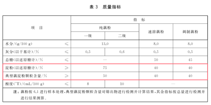 GB/T 25733 - 2022是推荐性国标,根据藕粉含量及加工工艺不同分为纯藕粉(等级有一级和二级)、速溶藕粉、调制藕粉。该标准明确要求纯藕粉的典型藕淀粉颗粒含量≥50%,速溶藕粉、调制藕粉≥40%。