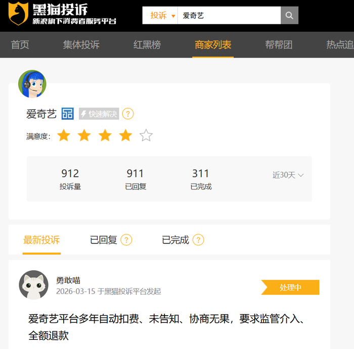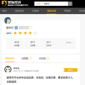 深圳商报读创客户端记者查询发现,黑猫投诉平台上,近30天有关爱奇艺的投诉量达到912条,其中大部分都与会员费有关。