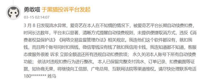 3月15日,有网友投诉先前发现银行流水异常,“爱奇艺在网友本人在不知情的情况下,长期自动续费扣费长达数年。平台未以显著、清晰方式提醒自动续费规则,未提供便捷取消方式,违反《消费者权益保护法》《网络交易监督管理办法》相关规定。”网友表示,并没有使用该软件就产生扣费,而且两个账号同时扣钱,微信零钱没有钱了就扣信用卡钱。并且客服态度服务很差。诉求是立即全额退还所有违规自动扣费款项; 永久关闭本人账号下所有自动续费功能; 依法对违规扣费行为进行整改。
