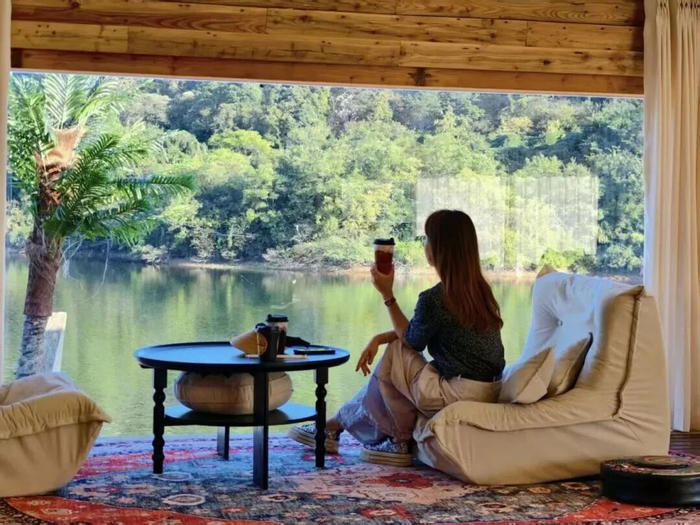这里背靠龙山,毗邻龙山湖,湖光潋滟,是触手可及的诗与远方。点一杯咖啡慢悠悠等着蓝调时刻,把夕阳下的绝美晏湖留在心里。