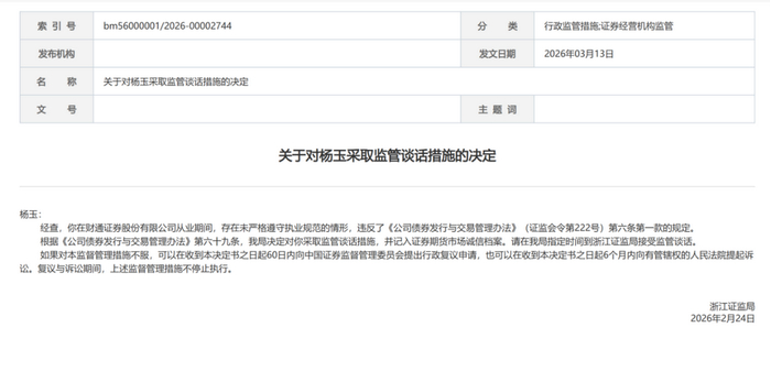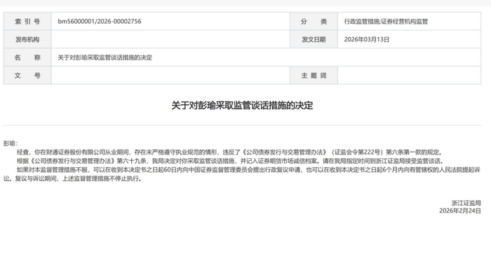 浙江证监局决定对彭瑜、杨玉采取监管谈话的监督管理措施,并将相关情况记入证券期货市场诚信档案,并且两人需在规定时间内前往浙江证监局接受谈话。
