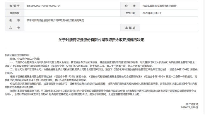 托管业务多重违规,子公司合规缺位,浙商证券被责令改正