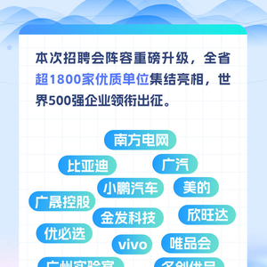 2026年“百万英才汇南粤”行动计划,以高规格综合招聘会拉开序幕。按照安排,3月15日—16日,“百万英才汇南粤”2026年春季大型招聘会在广州市广交会展馆D区17.1、17.2馆盛大启幕!超1800家企事业单位、7万+岗位广邀天下英才逐梦湾区、扎根南粤。今年的春季大型招聘会有哪些看点?一组海报带你了解。