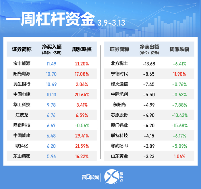 宝丰能源本周获融资净买入居首,净买入额为11.49亿元。阳光电源、民生银行、中国电建净买入额居前,金额分别为10.7亿元、10.49亿元、10.13亿元;北方稀土、宁德时代、烽火通信遭净卖出额居前,金额分别为13.68亿元、8.65亿元、7.45亿元。