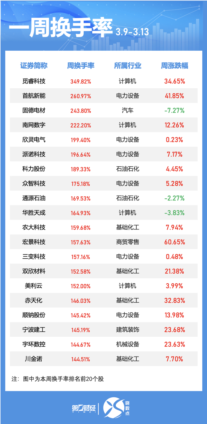 从一周涨跌幅来看,本周换手率超过100%的个股中,宏景科技、首航新能、觅睿科技、赤天化本周累计涨幅居前,均超30%。