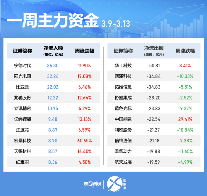 个股方面,宁德时代、阳光电源、比亚迪获主力净流入居前,分别为36.3亿元、32.24亿元、22.02亿元;净流出方面,华工科技、润泽科技、拓维信息遭主力净流出居前,分别为50.81亿元、34.84亿元、34.83亿元。