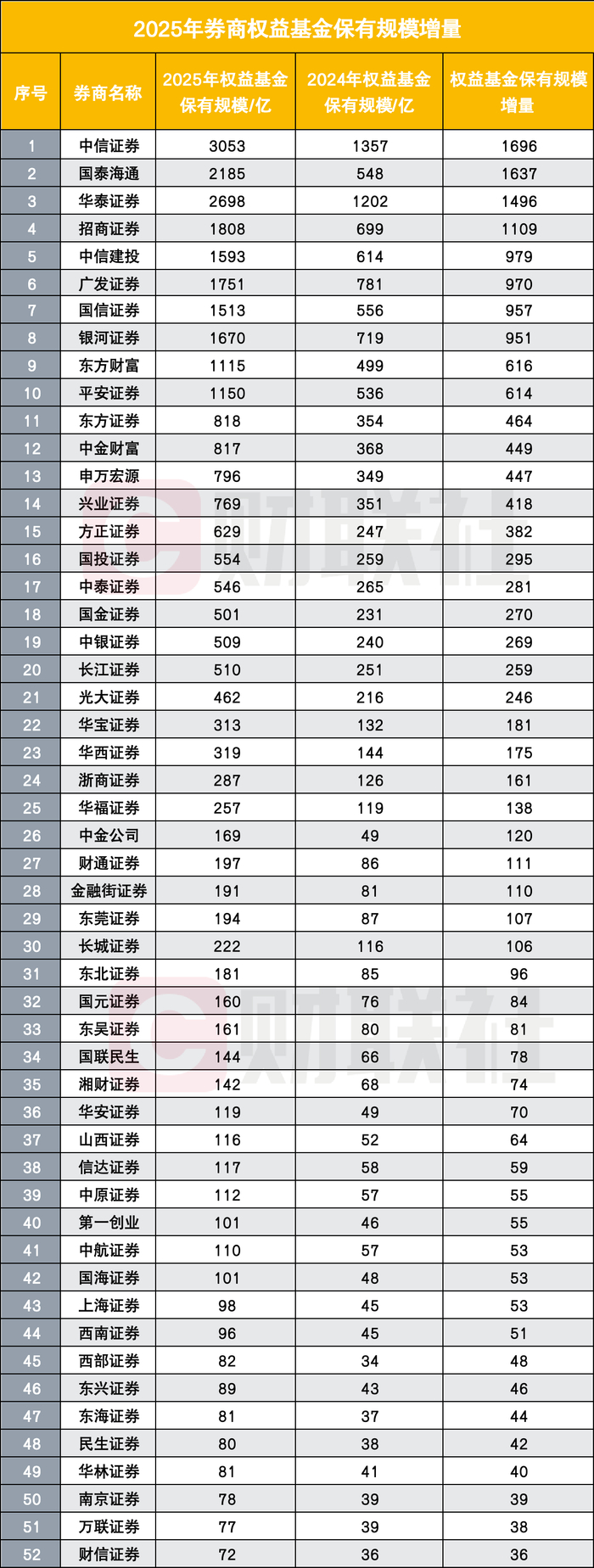 权益基金中,中信证券以 1632 亿元保有规模领先,华泰证券(1432 亿元)、国泰海通(1207 亿元)构成第二梯队,三家券商权益基金规模均实现双位数增长,其中国泰海通增幅达 23.42%。