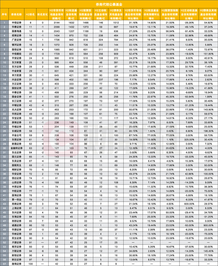 非货基金方面,中信证券以 3144 亿元的保有规模稳居券商首位,较上半年增长 31.16%,增速在头部券商中表现突出;华泰证券、国泰海通紧随其后,保有规模分别达 2099 亿元、2043 亿元,环比增幅均超 20%。