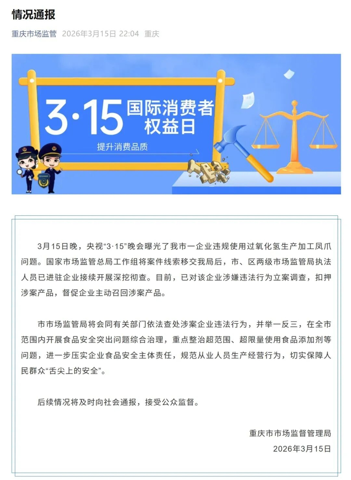 3月15日晚,央视“3·15”晚会曝光了我市一企业违规使用过氧化氢生产加工凤爪问题。国家市场监管总局工作组将案件线索移交我局后,市、区两级市场监管局执法人员已进驻企业接续开展深挖彻查。目前,已对该企业涉嫌违法行为立案调查,扣押涉案产品,督促企业主动召回涉案产品。