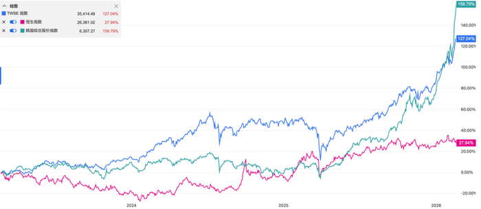 我们的台湾股市(加权指数)以及东邻的韩国股市(KOSPI)在近几年的表现确实令人瞩目,尤其是进入2024年至2026年这段时期,两地市场一直在不断刷新历史高点。