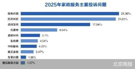 2025年家政服务相关投诉总量达7061件,累计涉诉金额超1300万元。从投诉问题结构看,投诉高度集中于服务质量与履约环节:服务问题(25.36%)、经济纠纷(24.65%)位列前两位,并列成为最突出的行业痛点;虚假宣传以17.94%的占比紧随其后,上述三大问题合计占比近七成。此外,态度差(9.54%)、退款纠纷(5.1%)、乱收费(4.54%)等问题也较为突出,凸显出家政服务行业在服务质量把控、经济履约管理、宣传行为合规等方面存在明显的规范短板。