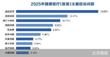 2025年健康医疗(医美)相关投诉总量达10082件,累计涉诉金额达1.39亿元。从投诉问题结构看,投诉集中在宣传合规、消费履约与服务管理层面:虚假宣传以19.86%的占比位居首位,成为最突出的行业痛点;其次为退款纠纷(12.41%)、预付卡纠纷(10.71%),三大问题合计占比超四成。此外,强制消费(8.96%)、乱收费(8.42%)、服务问题(5.96%)等问题也较为突出,整体凸显出医美行业在宣传合规、退款保障、预付卡管理、消费诱导等方面的规范短板。