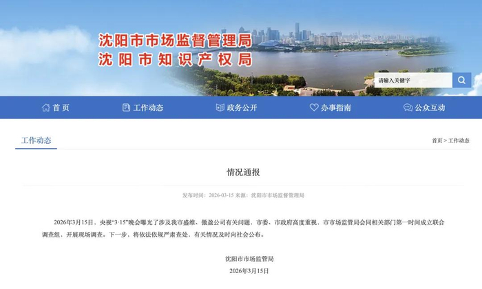 据沈阳市市场监督管理局3月15日晚通报:央视“3·15”晚会曝光了涉及该市盛维、傲盈公司有关问题,沈阳市委、市政府高度重视,市市场监管局会同相关部门第一时间成立联合调查组,开展现场调查。下一步,将依法依规严肃查处,有关情况及时向社会公布。