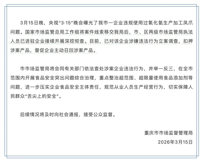 通报称,央视“3·15”晚会曝光了重庆市一企业违规使用过氧化氢生产加工凤爪问题。国家市场监督管理总局工作组将案件线索移交该局后,市、区两级市场监管局执法人员已进驻企业接续开展深挖彻查。目前,已对该企业涉嫌违法行为立案调查,扣押涉案产品,督促企业主动召回涉案产品。