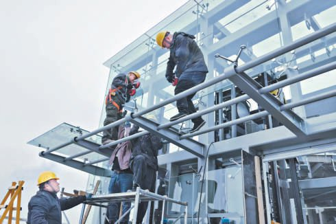 在首都公共艺术创作基地停好车后,穿过一片办公楼,拾级而上,一处二层的公共服务驿站跃入眼帘。这是启动段的配套服务设施,该驿站拥有通透的落地窗、开阔的二层平台,未来开放后,将成为六环高线公园的智慧化管理核心,为骑行、遛弯儿的人们提供智慧化便捷服务。