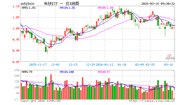 3月16日,科技ETF(515000)开盘跌0.20%,报1.002元。科技ETF(515000)重仓股方面,中际旭创开盘涨1.30%,新易盛涨0.51%,恒瑞医药涨0.18%,中芯国际跌0.70%,药明康德跌0.21%,海光信息跌0.24%,北方华创跌0.51%,胜宏科技涨0.00%,京东方A跌0.46%,兆易创新涨0.60%。