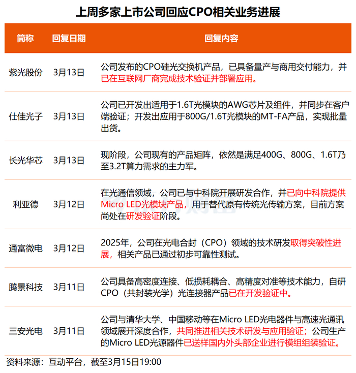 据不完全统计,上周有多家上市公司在互动平台对CPO相关提问进行了回复: