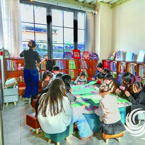 “我们这里开设了会员阅读专区,在这里儿童每月有四次绘本课和八次手工课。现在里面有绘本老师正在给孩子们读绘本,一起画绘本。手工课上,手工老师带着孩子们制作各种物件,像今天有雨,老师带着孩子们制作了这个下雨风铃,上面是云朵造型,下面的流苏是雨滴,孩子们在做手工的同时了解天气、人文。”书苑店员介绍。