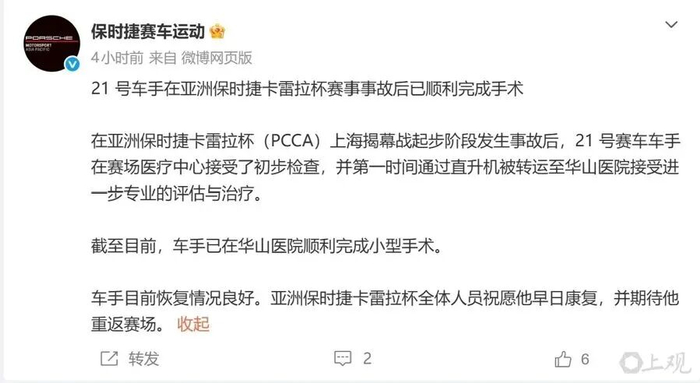 一位房车赛车手在周六的比赛中因车祸受伤,经现场医疗评估需立即送医急救。上海市公安局警务航空总队接令后,指派H155型直升机机组立即启动应急救援程序,将受伤车手第一时间送往华山医院接受手术。目前得到的消息是车手恢复良好。