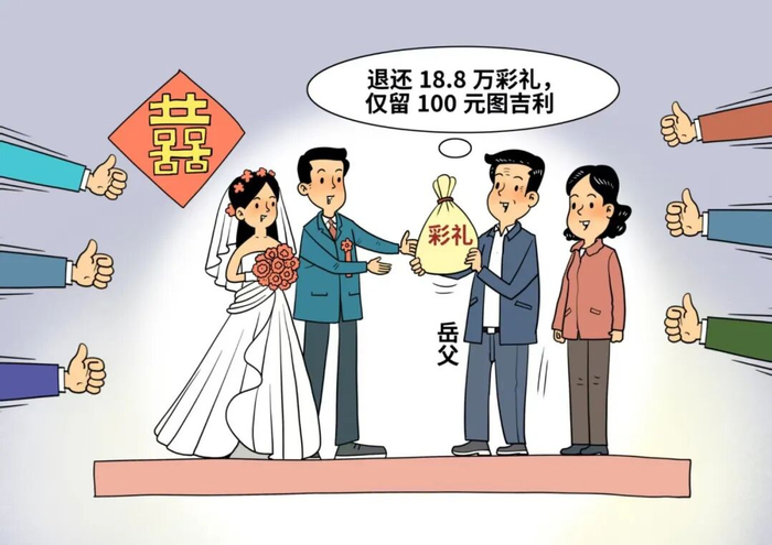 近日,一则“婚礼现场岳父退还18.8万元彩礼,仅留100元图吉利”的视频在社交平台引发广泛传播与点赞。新娘父亲“年轻人不要让金钱蒙蔽”的朴素想法,为小两口的婚姻减了负、指了路。今年全国两会上,多名代表委员关注高额彩礼问题,并积极建言献策。整治高额彩礼问题,还需综合施策,持续发力。