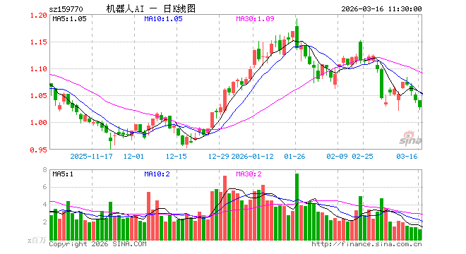 3月16日,截止午间收盘,机器人ETF(159770)跌1.15%,报1.028元,成交额1.16亿元。机器人ETF(159770)重仓股方面,科大讯飞截止午盘跌0.97%,汇川技术跌2.05%,拓普集团跌1.54%,大华股份跌1.05%,大族激光跌3.10%,双环传动涨0.31%,石头科技跌2.88%,中控技术跌2.54%,绿的谐波跌2.93%,机器人涨0.00%。