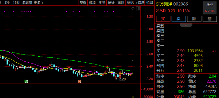 盘初,海洋经济概念拉升,东方海洋(002086)、中水渔业涨停,东方海洋超100万手买单封板,中科海讯、神开股份、深水海纳、巨力索具、海兰信、克莱特、亚星锚链高开。