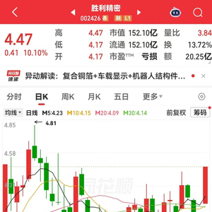 约在10:52,胜利精密(002426)股价突然拉升,并在2分钟内封住涨停板,涨停板封单一度超过385万手。公司目前主营业务为消费电子和汽车零部件业务。公司此前发布业绩预告显示,预计2025年净利润亏损3.65亿元至7.3亿元。