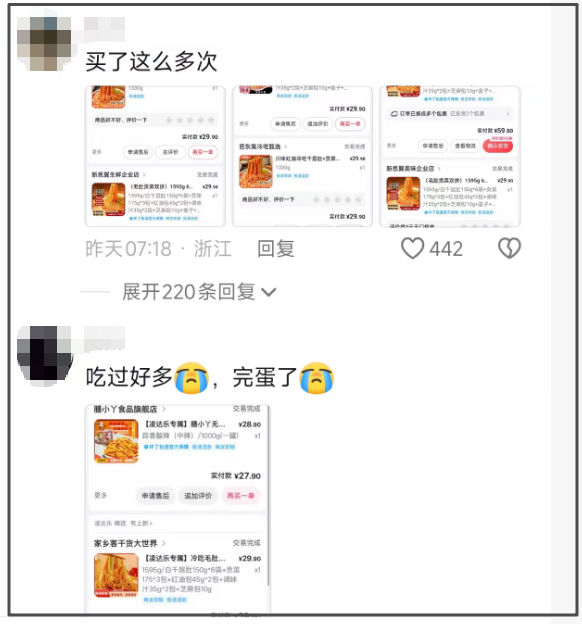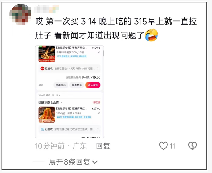 有网友在凌达乐账号的评论区反映,自己曾多次购买这款毛肚,还有网友称自己食用后拉肚子。