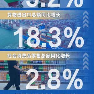 市场销售增速回升,固定资产投资由降转增,货物进出口快速增长。1至2月份,社会消费品零售总额86079亿元,同比增长2.8%,比上年12月份加快1.9个百分点;全国固定资产投资(不含农户)52721亿元,同比增长1.8%,上年全年为下降3.8%;货物进出口总额77321亿元,同比增长18.3%,比上年12月份加快13.4个百分点。
