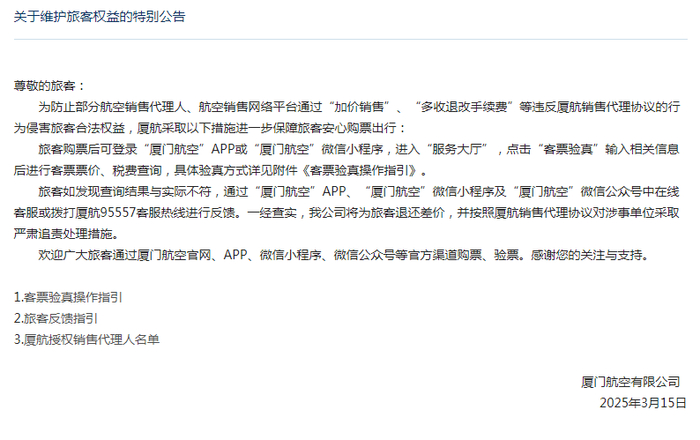 旅客购票后可登录“厦门航空”App或“厦门航空”微信小程序,进入“服务大厅”,点击“客票验真”输入相关信息后进行客票票价、税费查询。如发现查询结果与实际不符,通过“厦门航空”App、“厦门航空”微信小程序及“厦门航空”微信公众号中在线客服或拨打厦航95557客服热线进行反馈。一经查实,我公司将为旅客退还差价,并按照厦航销售代理协议对涉事单位采取严肃追责处理措施。