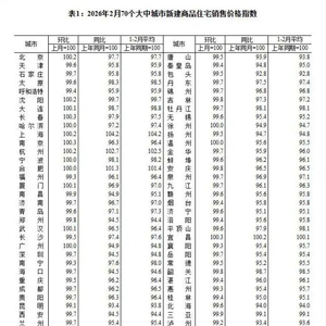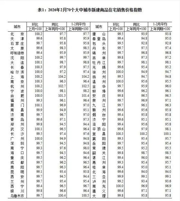 3月16日,国家统计局公布的2026年2月70个大中城市商品住宅销售价格变动情况显示,新房销售价格环比上涨或持平城市个数比上月增加,一线城市由环比下降转为持平,其中北京、上海均环比上涨0.2%。70个大中城市中,新建商品住宅销售价格环比上涨城市有10个。