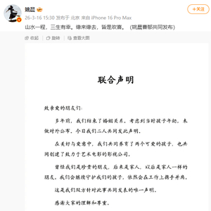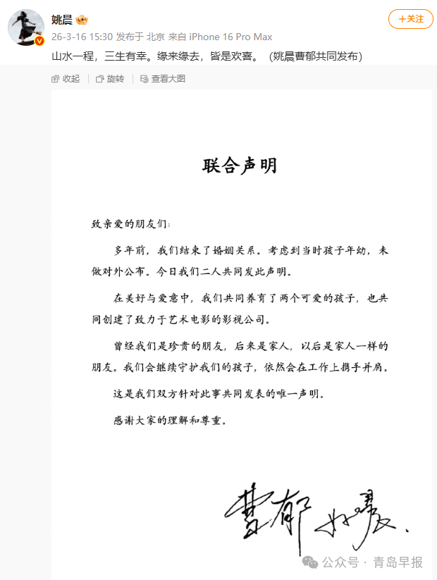 多年前,我们结束了婚姻关系。考虑到当时孩子年幼,未做对外公布。今日我们二人共同发此声明。