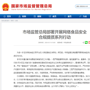 为进一步压实网络食品交易平台及入网经营者主体责任,即日起,市场监管总局部署开展网络食品安全合规提质系列行动。