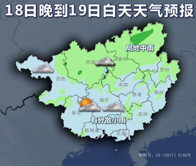 17日晚上到19日白天,桂北阴天有小雨、局地中雨,桂南多云到阴天有分散小雨。