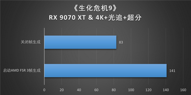 我们在4K分辨率下简单进行测试,光线追踪设置为高,超分辨率设置为AMD FSR 4.0.3高性能档,启用AMD FSR 3帧生成功能,可以让帧数从83大幅提高到141,提升幅度高达69.9%。