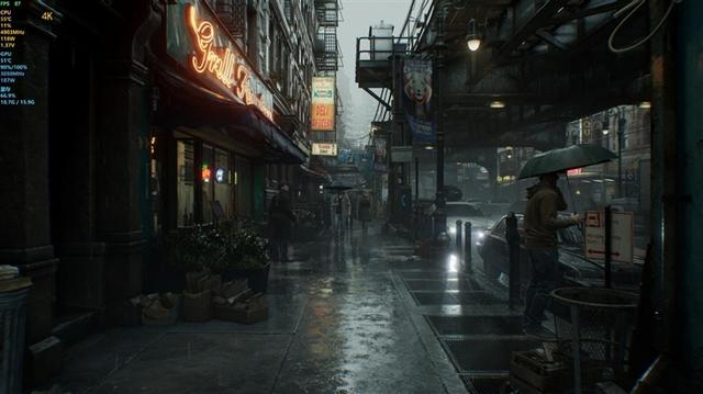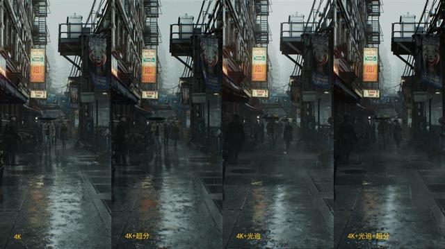 当光线追踪关闭时,画面仿佛是上个时代的游戏,灰扑扑没有层次感,几乎看不出场景正在下雨,但开启光线追踪后,画面的质感和层次立刻得到巨大提升,下雨的潮湿感和湿漉漉的车身反光,让画面更加真实。